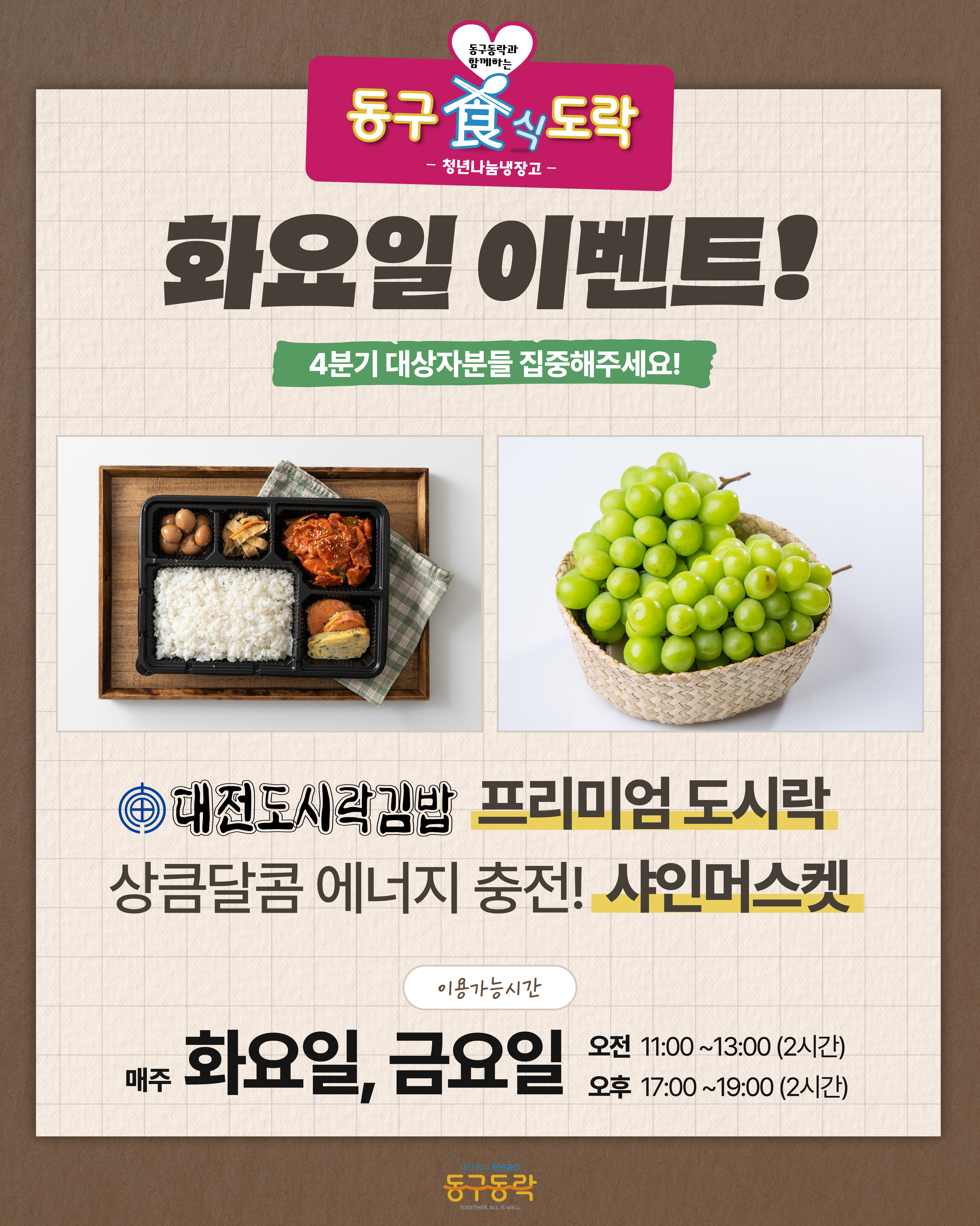 매주 화/금, 11~13시, 17~19시 동구동락에서 맛있는 한 끼 챙겨가세요! -