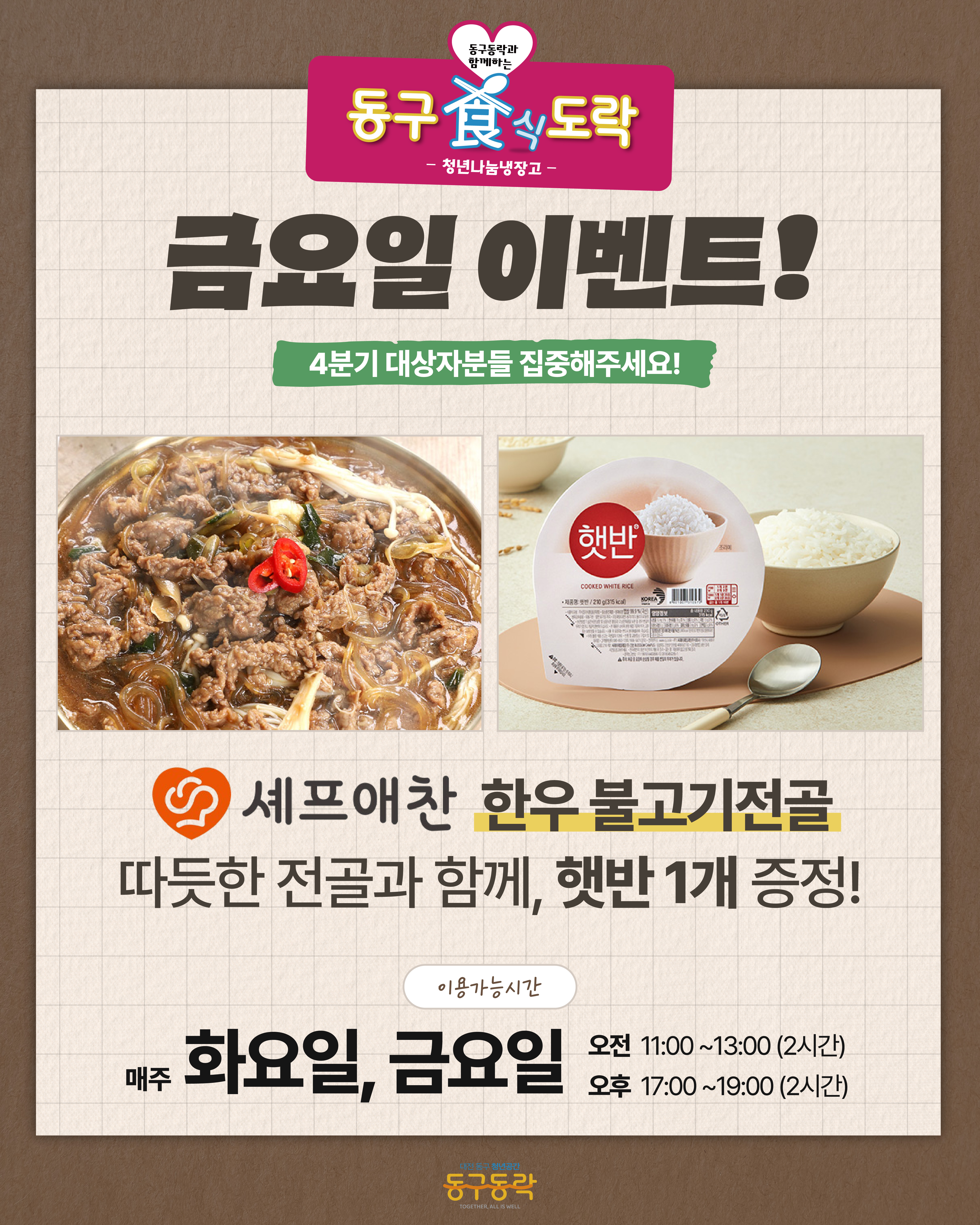 [동구식(食) 도락] 안녕하세요, 청년공간 동구동락입니다. 4분기 대상자분들, 집중해 주세요! 금요일 이벤트 소식을 전해드려요! [셰프애찬] 한우 불고기전골이 입고되었습니다! 따듯한 전골과 함께 드실 수 있도록, 햇반 1개를 증정해 드려요. 매주 화/금, 11~13시, 17~19시 동구동락에서 맛있는 한 끼 챙겨가세요!