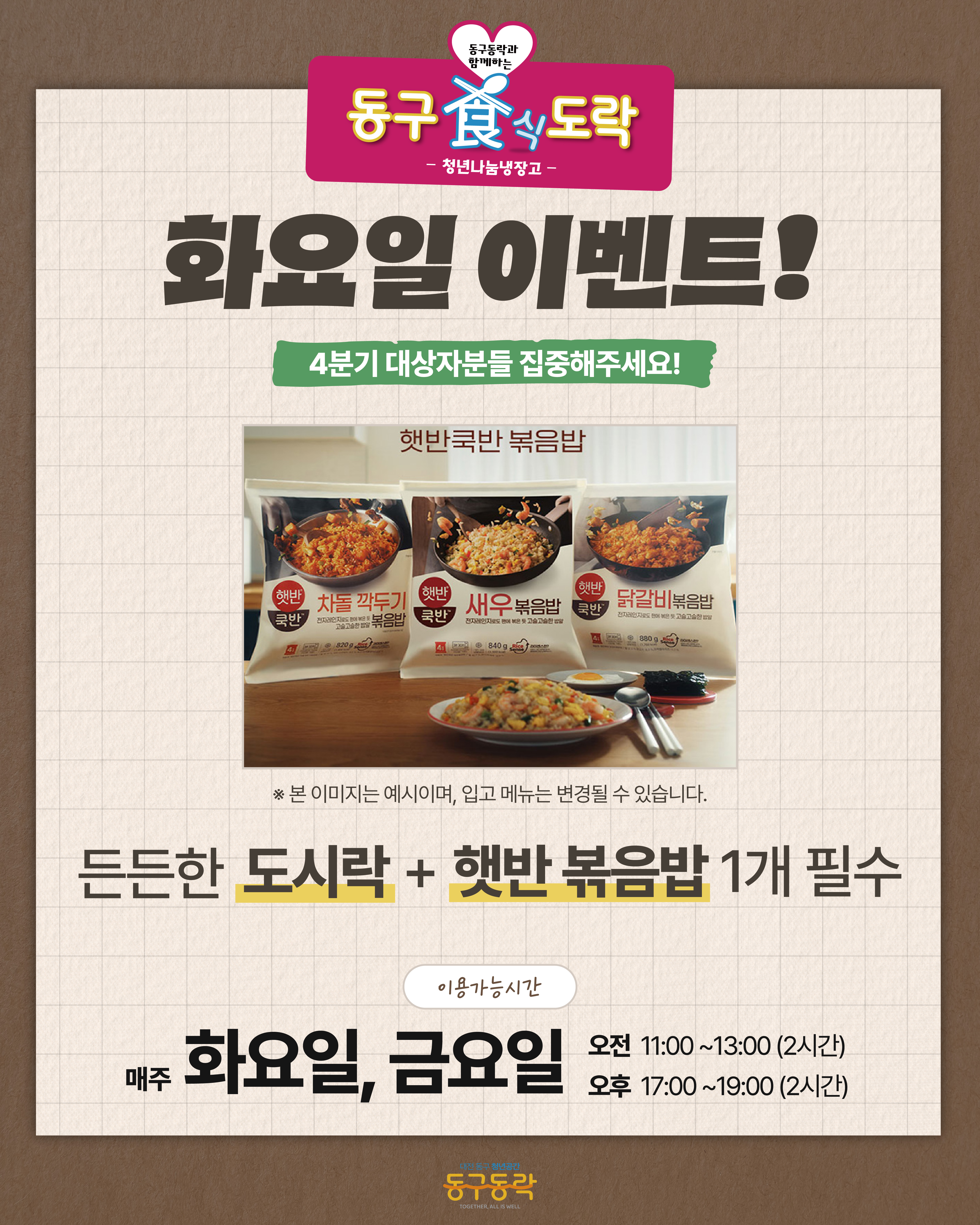 도시락은 한정 수량으로, 소진 시 종료됩니다. 시간 맞춰 방문해주세요!