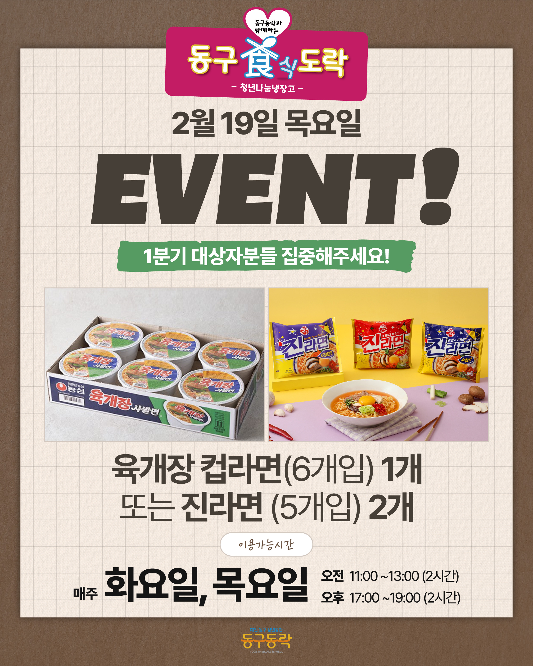 [동구식(食)도락] 2/19 목요일은 라면Day! 육개장컵라면(6개입) 1개 또는 진라면 (5개입) 2개
