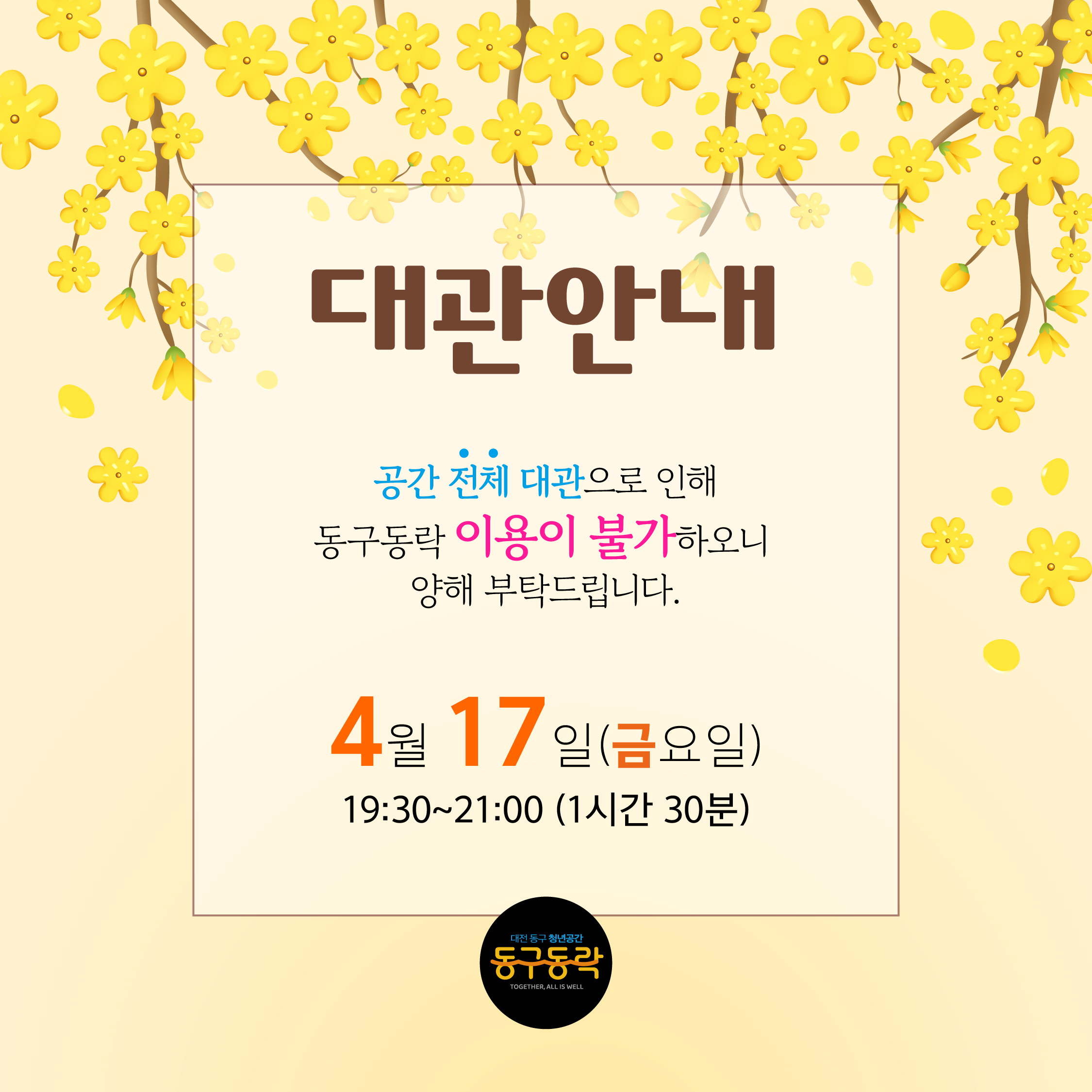 4월 17일(금) 19시 30분~21시 (1시간 30분) 공간 전체 대관으로 인해 동구동락 이용이 불가하오니 양해 부탁드립니다!