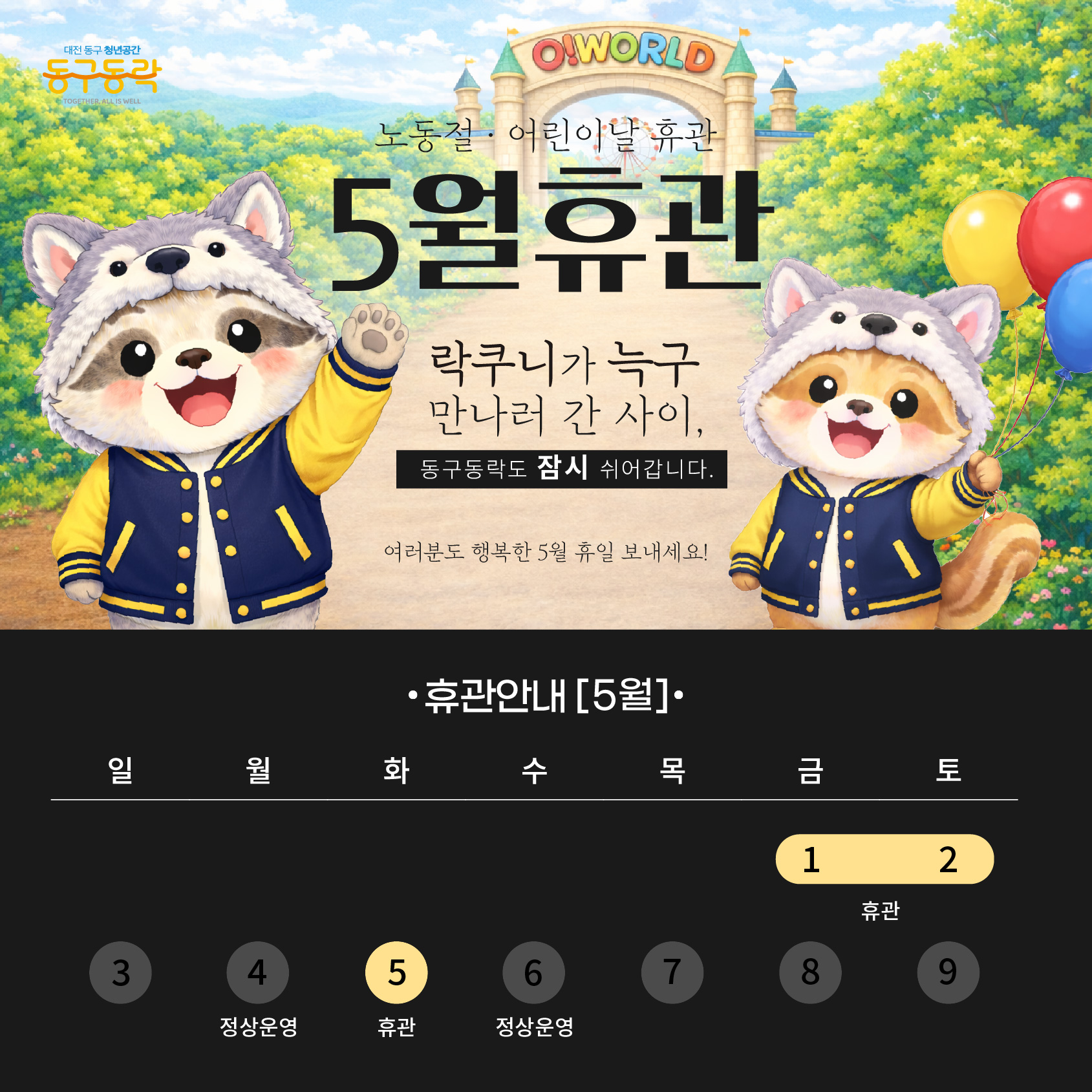 항상 동구동락을 이용해 주시는 분들께 감사의 인사를 드리며, 5월 휴관 안내를 아래와 같이 알려드립니다.