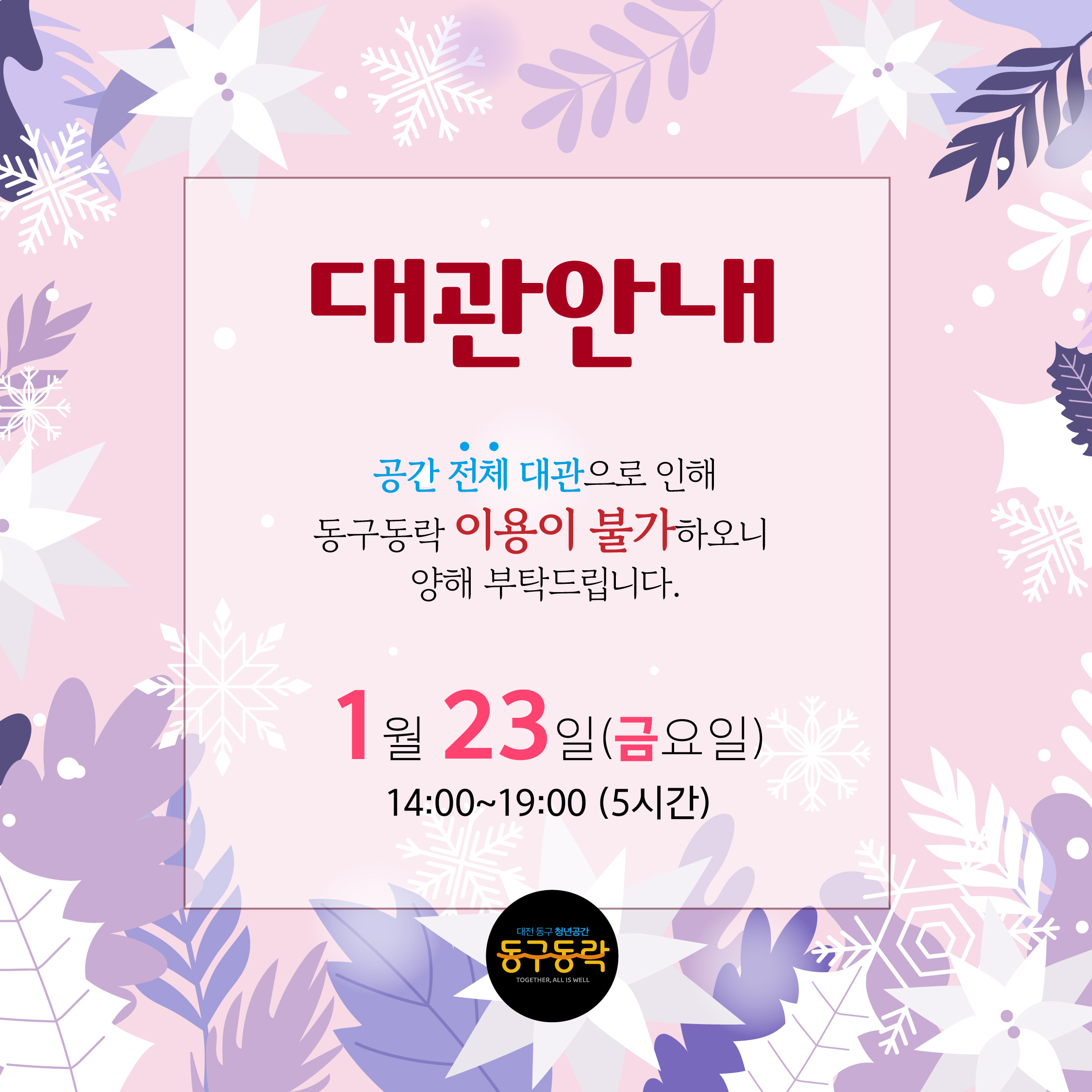 1월 23일(금) 14시~19시 (5시간) 공간 전체 대관으로 인해